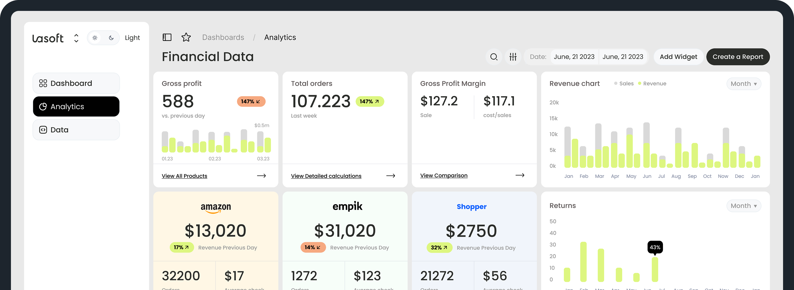 We customize dashboard solution for your e-Commerce business to guide your team through workflows and business operations and gain value from clear, actionable insights.